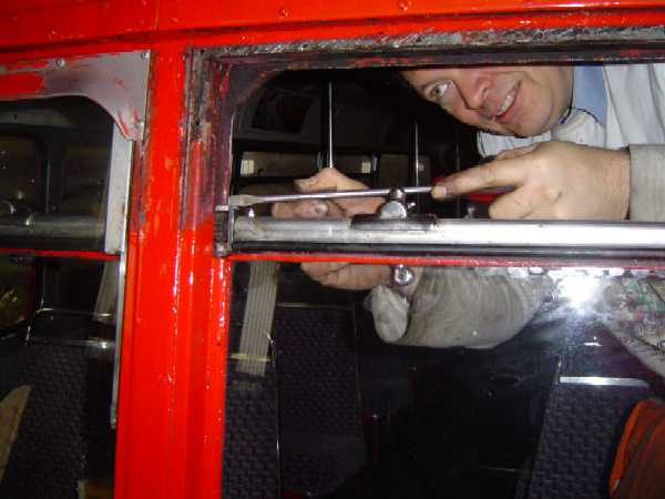 | Replacement window fitted to offside front before re-painting (and the bar being swapped over). | (Wrong) winding bar being fitted to the nearside - winding handle should be toward the side of the 'bus. |